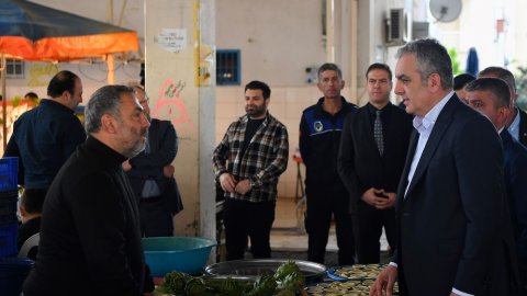 Altınkum Mahallesi kapalı pazar yerinde esnafı ziyaret eden Esen, tezgahları dolaşarak incelemede bulundu.