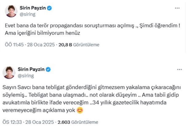 Payzın, konuyla ilgili bir sonraki paylaşımında "Sayın savcı bana tebligat gönderdiğini, gitmezsem yakalama çıkaracağını söylemiş. Tebligat bana ulaşmadı. Not olarak düşeyim. Ama tabii gidip avukatımla birlikte ifade vereceğim. 34 yıllık gazetecilik hayatımda veremeyeceğim açıklama yok" açıklaması yaptı.
