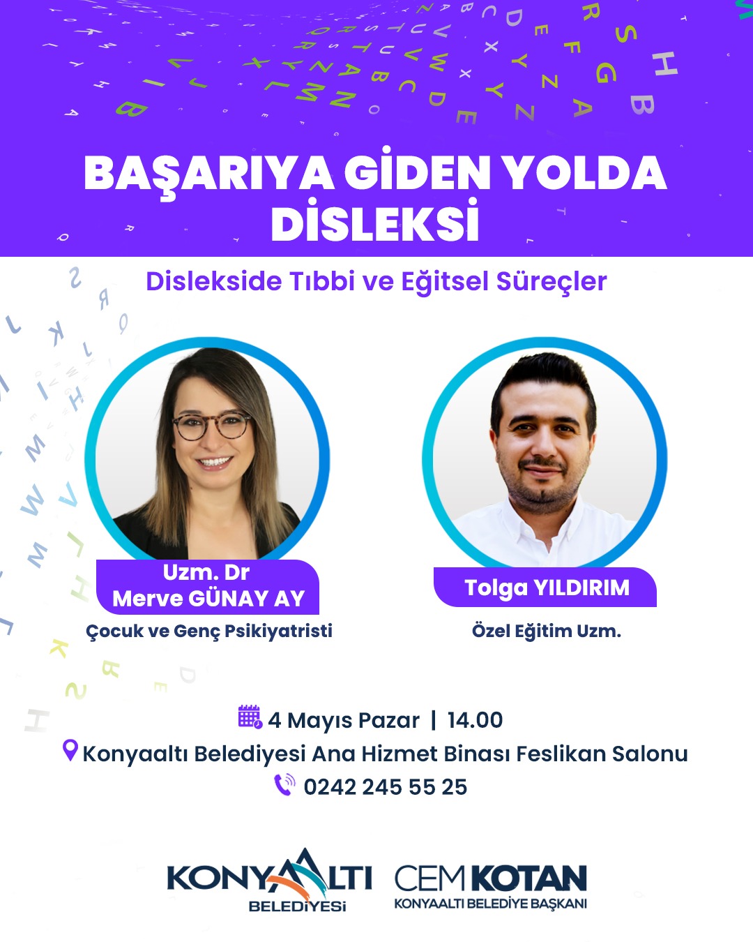 Çocuk ve Genç Psikiyatristi Uzman Dr. Merve Günay Ay ile Özel Eğitim Uzmanı Tolga Yıldırım’ın katılacağı “Başarıya Giden Yolda Disleksi” adlı konferans, 4 Mayıs Pazar günü saat 14.00’te Konyaaltı Belediyesi Ana Hizmet Binası Feslikan Salonu’nda gerçekleştirilecek.