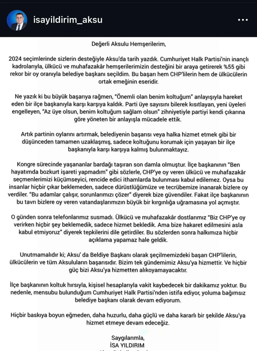 Antalya’nın Aksu ilçesinde Belediye Başkanı İsa Yıldırım, CHP’den istifa ettiğini açıkladı.