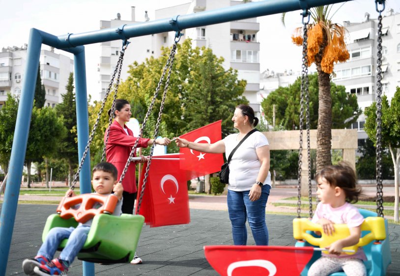 Konyaaltı Belediyesi, Cumhuriyet’in 100. yılı dolayısıyla 39 mahalleye yaklaşık 75 bin Türk bayrağı dağıtarak ilçeyi kırmızı beyazla süsledi.